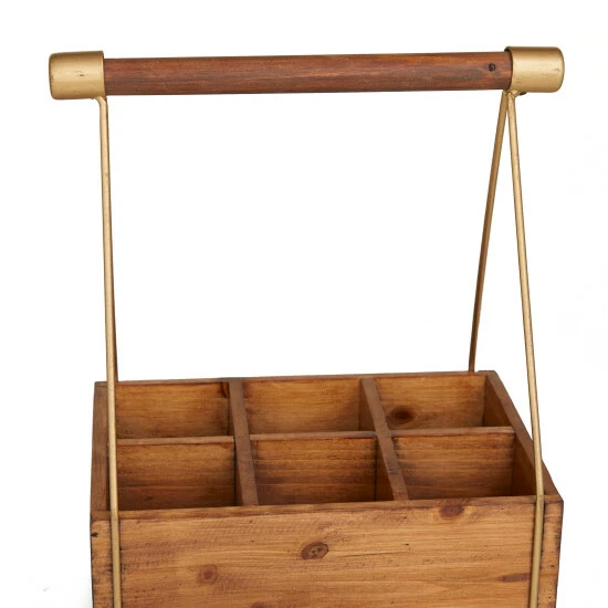 - Our wine bottle holder showcases a rectangular wooden rack with 6 square-shaped bottle slots and minimalistic accent body handles made of metal