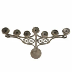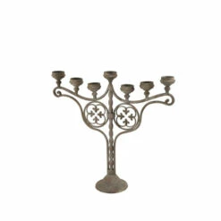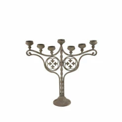 - Antique grayish-brown metal candle holder with a 7-candle candelabra with scrolled arms, stacked candle plates, and quatrefoil designs under each arm