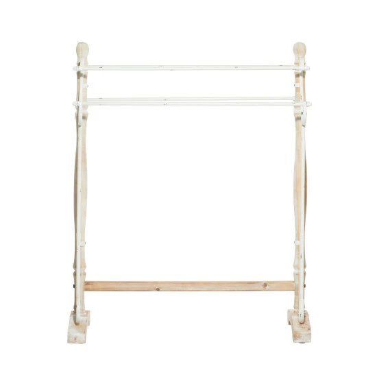 You can use this accent furniture as a decorative rack in farmhouse-styled entryway, living room, or home office. Display your blankets, quilts, table cloths, or even hang plants on the rungs of this leaning wall rack. A sturdy and long-lasting construction that for a years of enjoyment. Designed with black rubber stoppers at the base that prevent scratching furniture and table tops, as well as sliding around. Suitable for indoor use only. This freestanding quilt rack should hold about 20 to 25 pounds. Farmhouse-themed style.