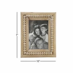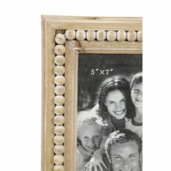 Display your favorite 5″ x 7″ photos or art prints in this natural wood picture frame with dimensional wood bead trim. This wood frame is made from textural Chinese fir and red pine woods with textural, dry, natural wood grain intact. The light beige wood hue has a soft whitewash finish over the rectangular frame and decorative wood beads that add a subtle yet stylish touch to this natural shelf decor. Ships in 1 carton. Easel stand backing with secure hardware for stability. Suitable for indoor use only. Photo frame can hold 1 picture with 5″x 7″ frame opening. This set includes 2 photo frame. Farmhouse-themed style.
