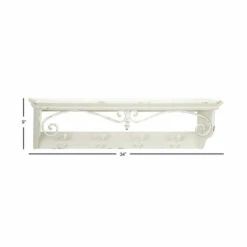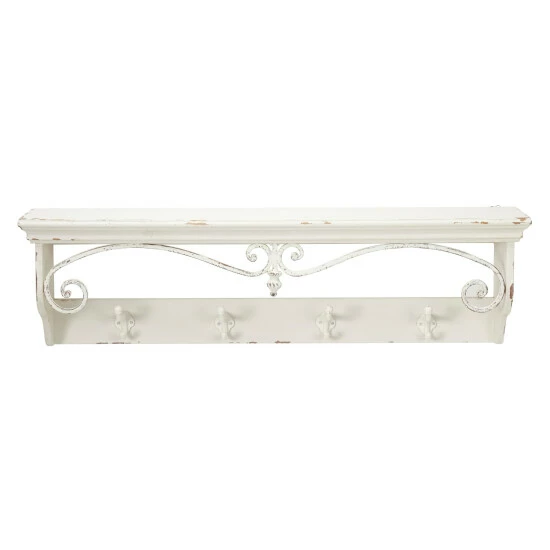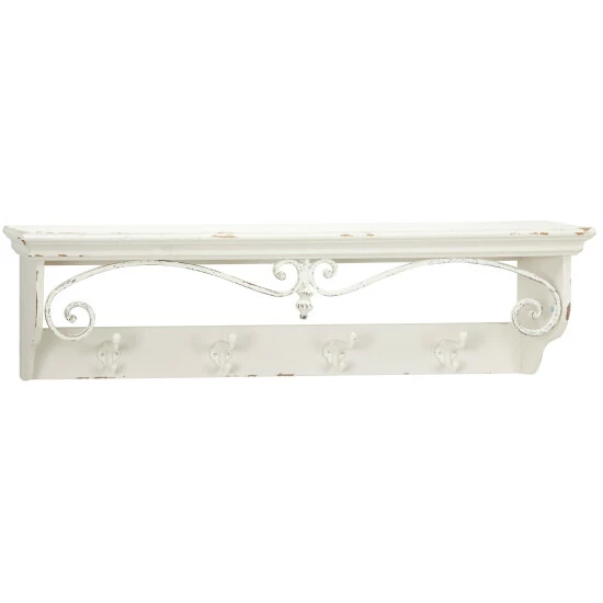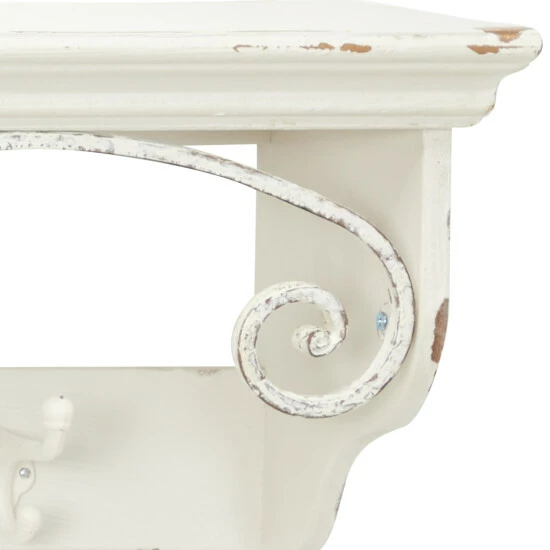 This antique-inspired wood wall shelf features a carved ledge top, iron scrollwork accent, and 4 metal coat hooks. Whether you display wall decor or hang lightweight jackets, this Country Cottage accent decor also functions as a display shelf for framed photos and plants with sturdy metal hooks for to hang decorative orbs, botanicals, or sweaters. The distressed white finish is bright and airy, suitable for French Country and Country Cottage styled spaces, along with the decorative distressing for a vintage feel. Easy and ready to hang by hardware in back, this white wall rack shelf is a must-have to round out your French country cottage look!
