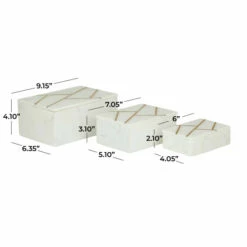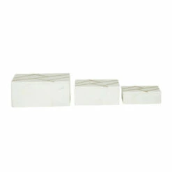 Store your trinkets and jewelries in chic and glam style with these marble boxes that elegantly complements your console or coffee table theme. A perfect way to add depth and texture to your surface space with this compact and discreet box. Give your surface space a finishing touch with these beautifully crafted decorative boxes. Suitable for indoor use only. Items come shipped in one carton. Marble is a product of nature and no two pieces are exactly alike; it is prone to variations in color and/or patterns in the material that adds to the beauty and charm of the piece. Made in India. Set of 3 marble boxes. Glam design.