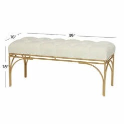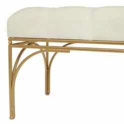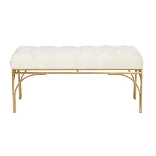 - This gold metal bench is made of robust iron, durable MDF wood, and smooth velvet fabric