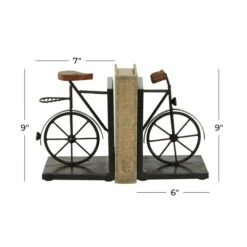 This set of bookends brings a fun sense of adventure to your book shelves with a vintage black bicycle “split” in two to create each bookend. A couple of natural wood accents for handles and seat add an earthy element, as well. The smooth, 90-degree metal bookend edges protect your book covers while sturdily propping up your books. Rubber stoppers keep these metal bookends from scuffing surfaces and keep them in place so your books won’t budge. Designed with rubber stoppers at the base that prevent scratching furniture and table tops, as well as sliding around. This item comes shipped in 1 carton. Suitable for indoor use only. Made in India. This set includes of 2 bookends. Traditional theme.