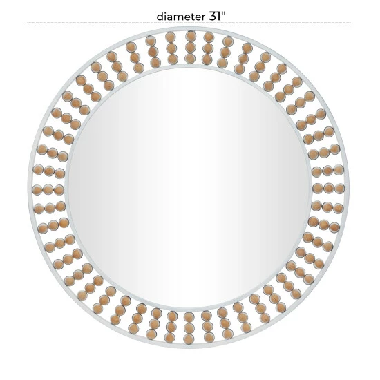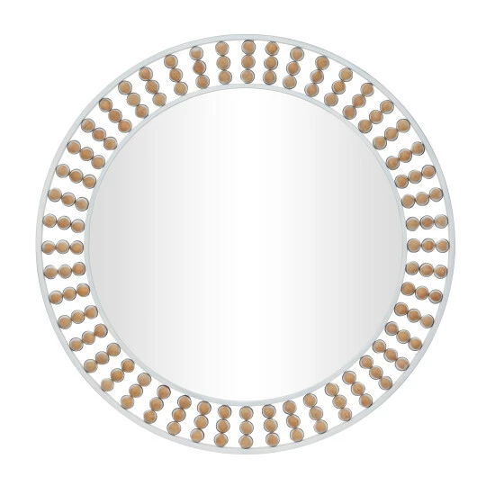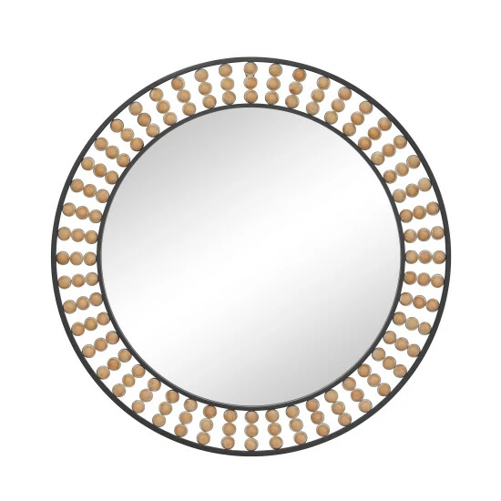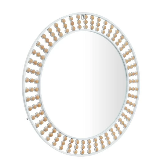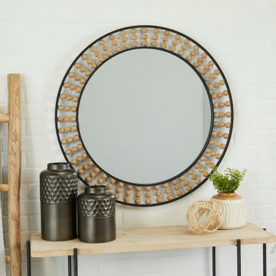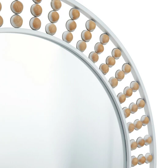 - Wooden beads cut in half adorn the frame of this wall mirror