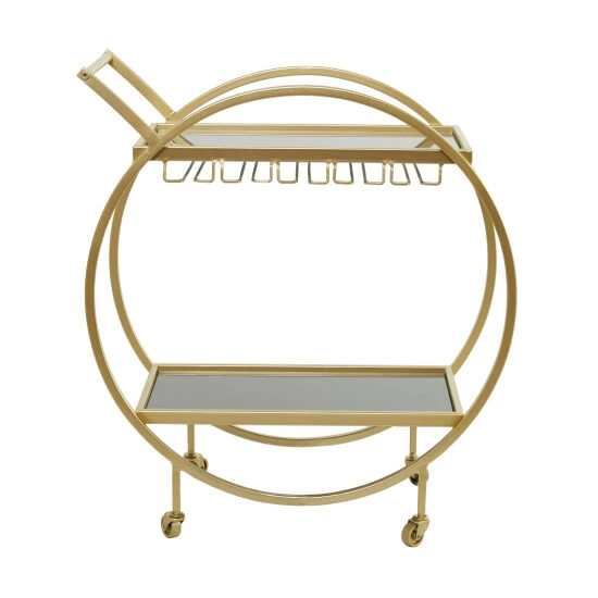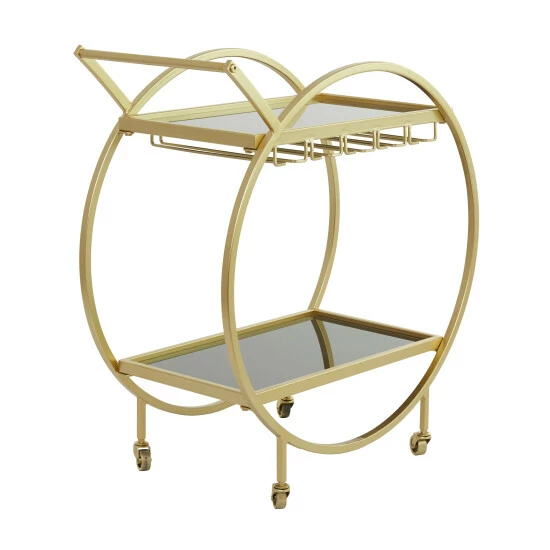 Serve refreshments and meals with this 2-shelf bar cart that boasts style and function. An optimal mobility piece of furniture that will show to wow your guests for any occasion. A versatile piece ideal for storage or decorative display in any space. This item comes shipped in one carton. Suitable for indoor use only. Furnished with 2 glass shelves. Contemporary design. Holds up to 30 pounds.