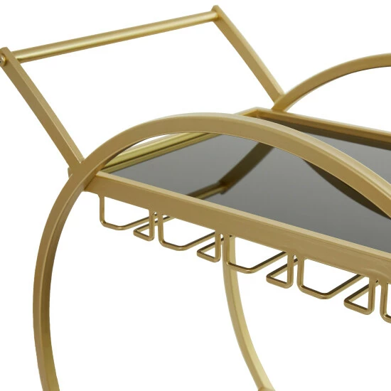 - Metallic gold, black, silver finish complement the black tinted glass shelves of this bar cart