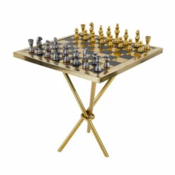 - This table chess set highlights a harmony of metallic gold and black / white and silver pieces and checkered top