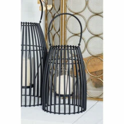 - Cleverly crafted, it flaunts an assemblage of vertical railings to hold a suspended candle holder
