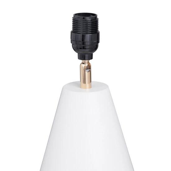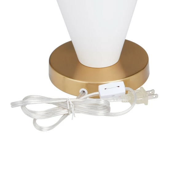 - This decorative table lamp highlights a white shade, a white / black body with gold strip, and a gold base