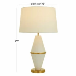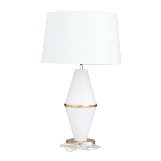 - This lamp for accent tables features a white drum shade, white / black diamond-shaped body with gold strip, and gold round base