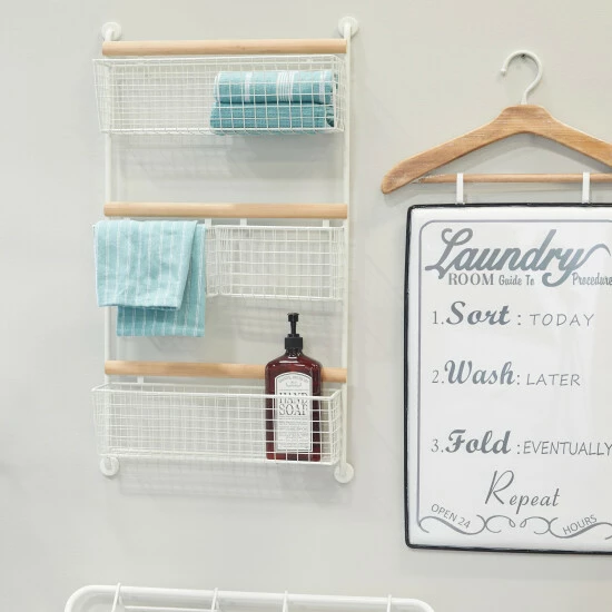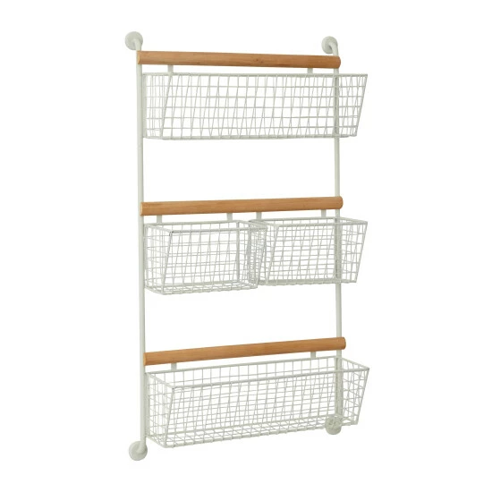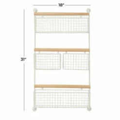 Accessorize your living space or bathroom and bring a farmhouse vibe with this functional basket style wall shelf that provides optimal storage options. Utilize your wall space to add more storage for a space saving solution in any compact area. Maintain an organized home to create comfort and a welcoming atmosphere. This item comes shipped in one carton. Item comes with side bars with 4 round metal accents that can be fixed to the wall. Suitable for indoor use only. Farmhouse Theme. This item has 3 shelves. Holds up to 20 pounds.