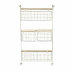 - A rectangular farmhouse wall shelf featuring 4 grid-style metal baskets supported by brown wooden rods and white or black curved metals at the sides that can be mounted on the wall
