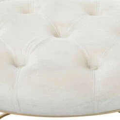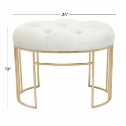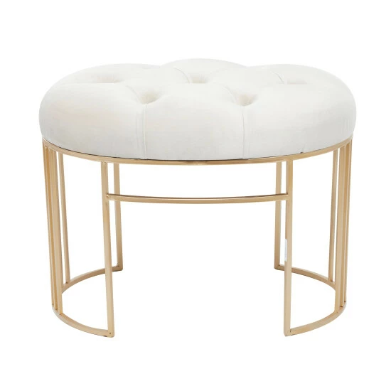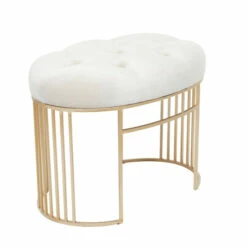 - A tufted accent bench featuring a cream, black, or grey cushioned seat and gold metal frame