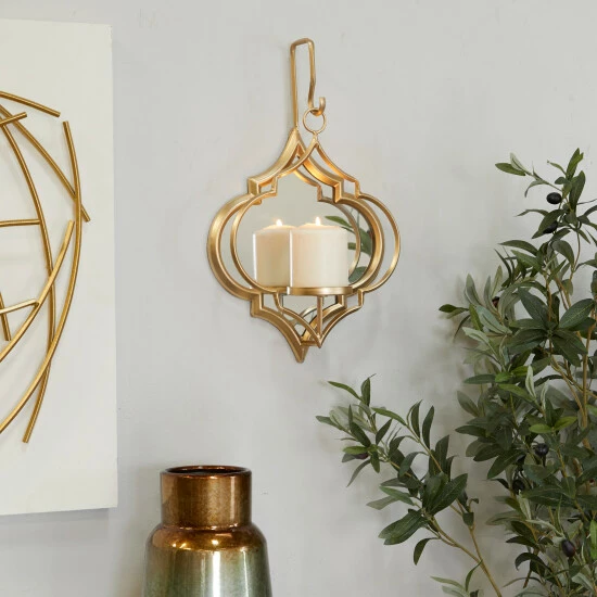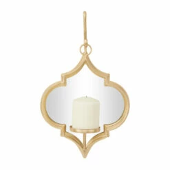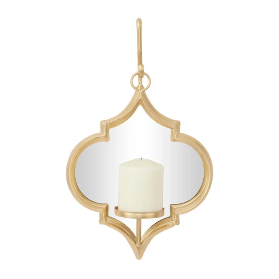 - Featuring a candle wall sconce with a quatrefoil structure, hanging gold or black metal frame, reflective glass panel, and round candle plate that can be used for pillar or votive candles