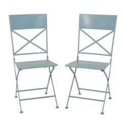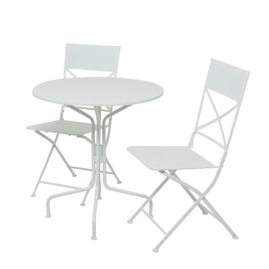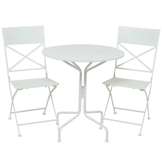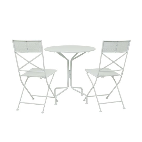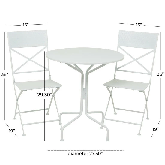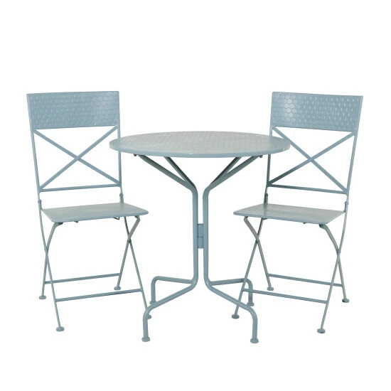 Relax in the patio with this white, light blue, turquoise outdoor seating set that will transform your space into a welcoming and cozy oasis. Designed with rubber stopper at the base that prevents scratching furniture and tabletops, as well as sliding around. This item ships in 1 carton. Suitable for indoor and outdoor use. Holds up to 250 pounds. Use sponge with mild soap and warm water and then rinse with a garden hose. Avoid using abrasive cleaning pads or detergents when cleaning outdoor metal furniture. Set of 3 bistro seating comes with one table and two chairs. Traditional style.