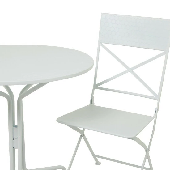 - White, light blue, turquoise outdoor seating set featuring a round spacious top and 2 metal chairs with high back rest in a smooth finish for all day comfort