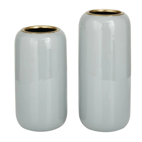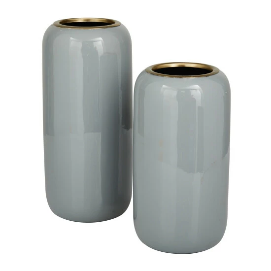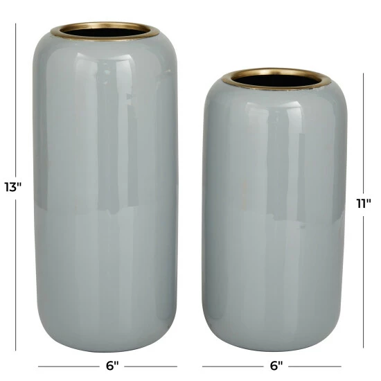 - These metal vases for décor features round cylindrical bodies in varying heights with gold-rimmed round openings and glossy gray, cream, blue, red, yellow, or green finish