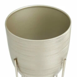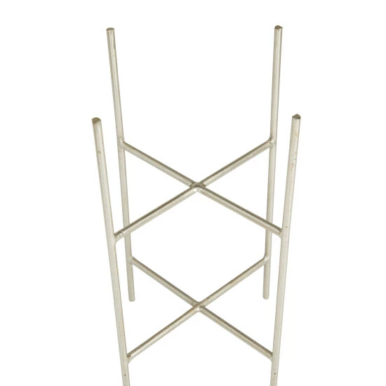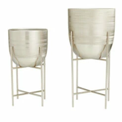 - These silver planters feature cylindrical pots with round bottoms and decorative linings along with thin open metal stands with x-shaped supports