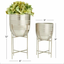 The simple yet bold design of this set of planters makes it an instant conversation piece and a gorgeous accent decor for your home. A smart chic style inspired living space knows how important mixing and matching is, especially when it comes to adding some greenery in your space. A sturdy and long lasting construction that for a long lasting display. This item comes shipped in one carton. Pots do not have drainage holes. This set comes with 2 metal planters. Modern Theme. Suitable for indoor use.