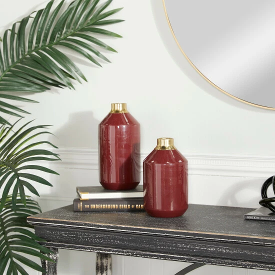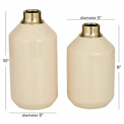 - These metal vases for décor feature round cylindrical bodies in varying heights with gold necks and small round mouth openings furnished with a glossy cream, red, blue, or yellow finish