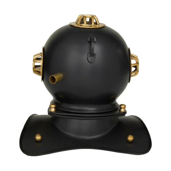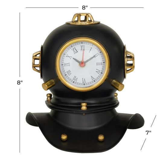 Improve your time management skills and keep a clock close by with this charming piece. A dashing display on any surface to help you manage your time throughout the day. Track your time while stepping up your interior design with this unique black diving helmet table clock that is perfect to display on top of any accent table. Runs on 1 AA battery not included. This item ships in 1 carton. Nautical table clock that has a white round clock face with black Roman numerals along with black and red clock hands. The clock mechanism runs silent. Suitable for indoor use only. Made in India. Nautical Theme.