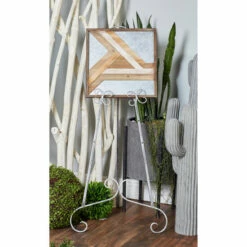 Cast some magic spells and golden fairy dust sparkles into your art rooms and house balconies by adding this traditional, gold floor-length iron metal easel into your oil painting canvas and charcoal sketches. Intricately crafted to perfection, this delicate metal easel comes in a smooth gold finish, and three vertical rods with scroll wire detailing on both legs and its holders. Their elegant and rustic exterior is comprised of solid iron material, offering durability and stylish functionality to any room and home interior space. This item ships in 1 carton. Suitable for indoor use only. Made in India. Traditional theme.