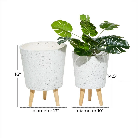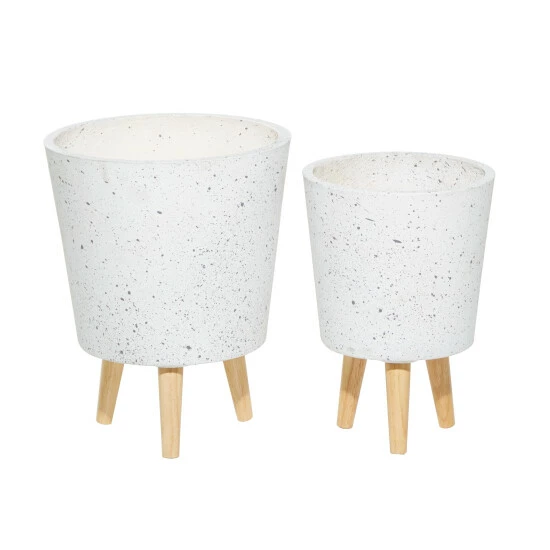 Create a chic and e-co friendly home by Incorporating some greenery in your living space, this truncated cone shaped white and grey marble textured fiber clay set of two planters will help you achieve that goal. The fiber clay construction of this planter means toughness without sacrificing beauty and elegance thanks to its unique truncated cone 3D geometric structure. The entire piece rests on a wooden tripod leg design with circular wooden legs in a light brown hue. This planter set will bring a much-needed freshness with indoor plants in your chic style living space. Recommended for use with indoor plants that do not require much water or sunlight, since there is no drainage hole. This item ships in one carton.