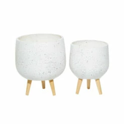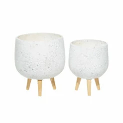 A smart chic style inspired living space knows how important mixing and matching is. especially when it comes to adding some greenery in your space. This cauldron shaped white/grey marble textured fiber clay planter 2-piece set is up for that task. The fiber clay construction of this planter means toughness without sacrificing beauty and elegance thanks to its unique cauldron shaped structure. The entire piece rests on a wooden tripod leg design with circular wooden legs in a light brown hue. This planter set will bring a much-needed freshness with indoor plants in your living room, dining room, home office or entry way. Recommended for use with indoor plants that do not require much water or sunlight, since there is no drainage hole. This item ships in one carton.