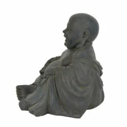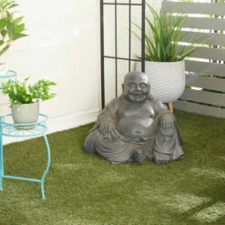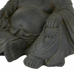 - Garden Buddha sculpture features a smiling Buddha figure on a sitting stance and showcases a prayer bead necklace on his left hand