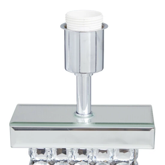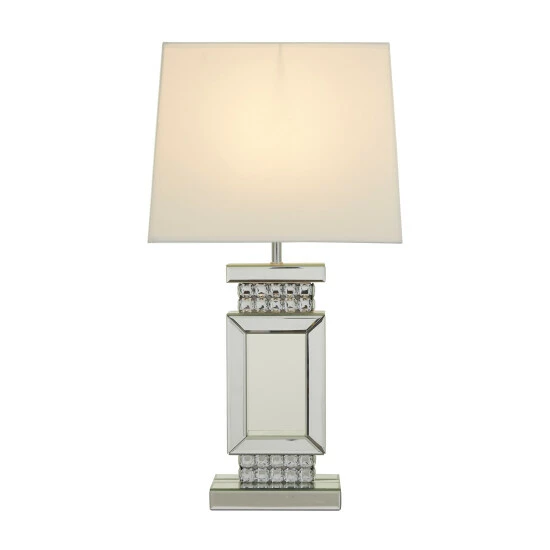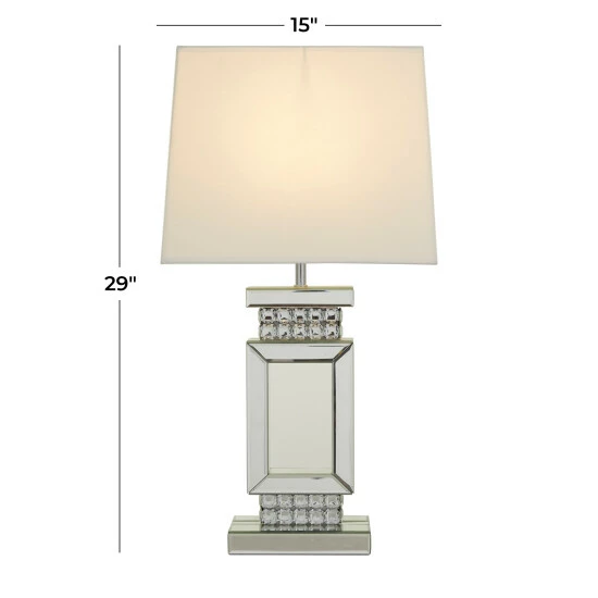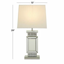 A silver table lamp that brings charm and elegant look that glows with decorative inspiration to give any room an instant decor upgrade. This eye catching lamp makes a playful addition to your surface space and beautifully illuminate its surrounding area. Make a statement with this unique lamp on mantle, console table or in any living space. Designed with rubber stoppers at the base that prevent sliding around as well as scratching the floor. This item comes shipped in one carton. The shade of this table lamp is securely mounted on the rectangular glass body and base. Suitable for indoor use only. This accent piece features a linen white square-shaped lampshade. Comes with an On/Off switch. Glam inspired. Table Lamp requires E26/Medium (Standard) bulb. The cord is 62 inches.