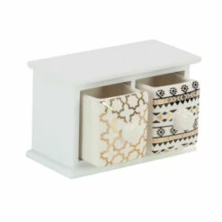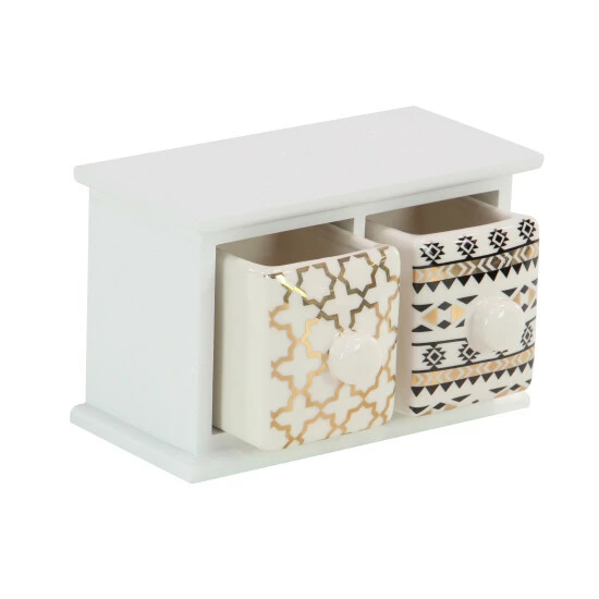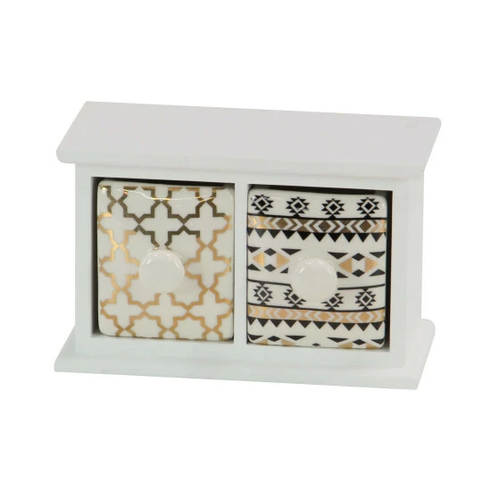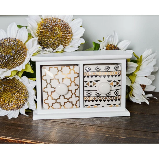 Serving both decorative and functional purposes, this 2-drawer wood and ceramic jewelry chest makes a perfect gift idea. A white-finished frame highlights this jewelry chest made from mixed MDF wood and porcelain. With cross and geometric details in black and gold finishes on the drawers, this jewelry chest can also double as a decorative accent to any room. Get this today for a price you’ll surely love!