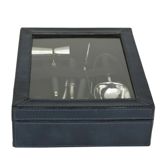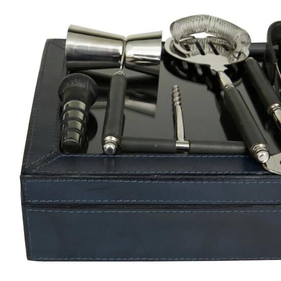 Looks stylish in your living room or kitchen as a serving tool set or as a decorative display. This sleek and well crafted bar tool set features a luxurious polish in a protective robust box. Make the perfect mixed drink with this 7-piece rectangular leather toolbox that can make great cocktails or ideal decoration on any accent table. This item ships in 1 carton. Suitable for indoor use only. Leather and hair on hide are natural products, and therefore no two will be alike. There may slight variations in pattern, natural blemishes, colors, and overall aesthetic of the product. Holds up to pounds. Made in India. Modern Theme.