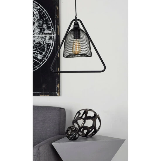 15″ x 15″ Modern Reflections iron pendant with bulb, features a metallic black finish, features an inverted-dome shaped shade with an triangular-outline-shaped iron outer frame
