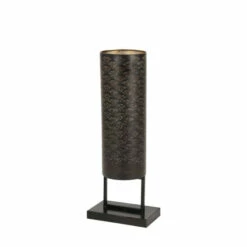 - Tall, cylindrical pierced black metal lantern table decor on a rectangular metal base