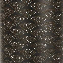 Achieve ambient, glowing light with modern design in this black metal cylinder lantern, featuring a pierced metal dotted fan design. Inside, you’ll find a reflective metallic gold interior housing a clear hurricane glass candle holder to safely light your pillar candle. Once lit, the boho style pierced metal design starts to glow!