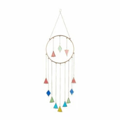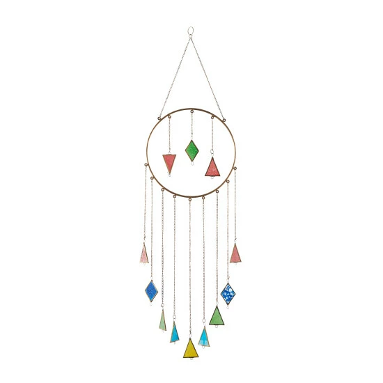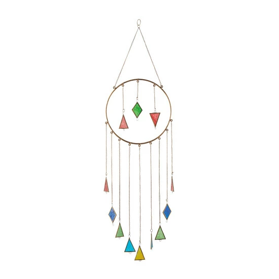 - Our glass and metal windchime showcases a dreamcatcher style iron body decorated by hanging glass chimes in different lengths, colors, and geometric shapes