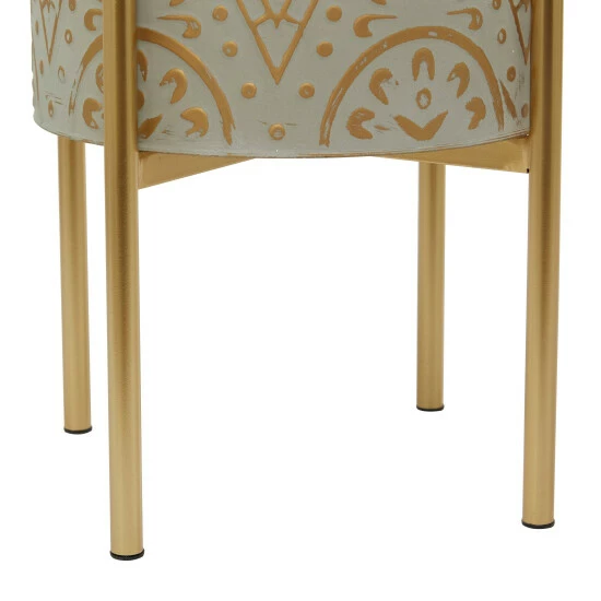 - Bohemian-inspired planters that feature brown/white, grey/white, or beige metal cylindrical pots with abstract patterns mounted on gold open metal stands with x-shaped supports and rubber stoppers