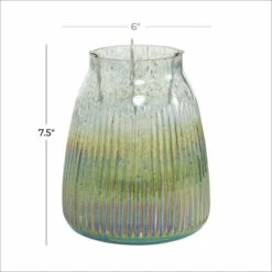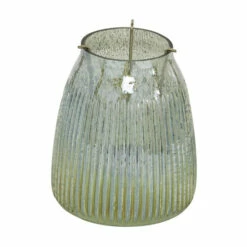 Display lighted candles in style with this rustic glass candle holder. The candle holder, hand-crafted in India, features a translucent holographic finish and pleated texture designed to add a modern feel to its rustic vibe. It also features a floating metal candle holder hooked on the sides to keep candles in place and replace the candles easily. This candle holder will hold one pillar candle. Ships in one carton. Suitable for indoor use only. Made in India. Contemporary design. Glass candle holder makes a great gift for any occasion.