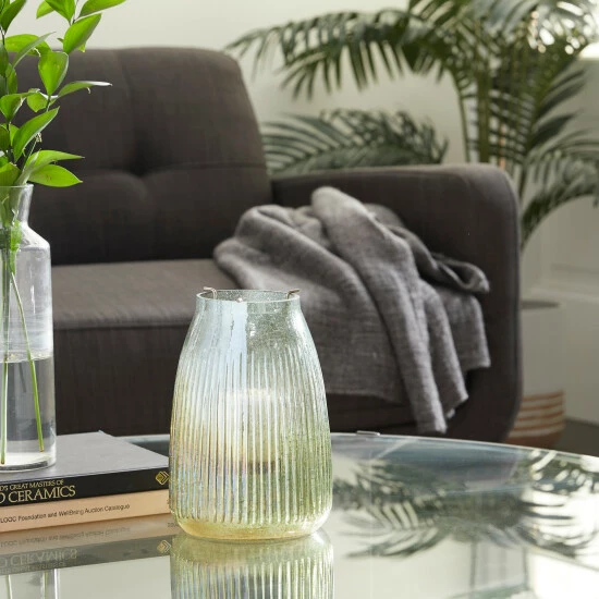 - Stunning candle holder features a reflective iridescent clear glass finish with yellow undertones