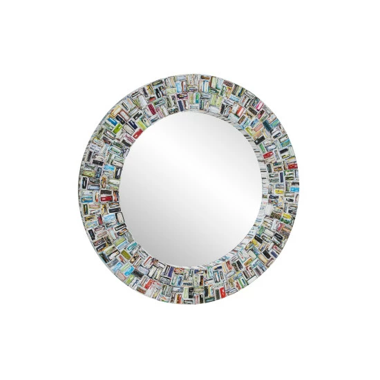 - One of a kind piece individually folded and rolled pieces of recycled paper from old colorful magazines, then placed and glued into a symmetrical pattern, and lacquered for a sealed finish around the reflective circular mirror
