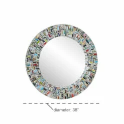 One of a kind and kaleidoscopic, this large round mirror is wrapped in a colorful, abstract art frame made from hand-rolled, recycled magazine paper, making for a lively and robust wall decor addition to your modern-styled home. This large wall mirror decor would look especially dynamic against a solid colored wall to emphasize its rich texture and movement from the almost pixelated effect of the folded-up magazine papers. Up close, you can appreciate the detail of every single piece of recycled paper, strategically wrapped and folded into spiraled rectangles and meticulously placed in a symmetrical color/shape pattern, creating an abstract design that you could stare at for hours. Easy to hang from the black canvas back with 2 round metal grommets. Suitable for indoor use only. Eclectic theme. This item comes shipped in one carton.