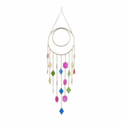 Let the wind give music to your ears as you hang this dreamcatcher inspired windchime on the top of your doors, windows, and balcony area. A light and delicate piece to create a whimsical atmosphere anywhere in your home. The soothing sound of this windchime will keep you relax and rejuvenated throughout the day. This item is shipped in one carton. Glass is cut into various shapes to form a ravishing collection of glass plated windchimes. This windchime features a durable chain hanger for easy hanging via nail or hook. Suitable for indoor and outdoor use. Made in India. Contemporary style.. These pieces are designed to offer any contemporary themed home a final touch.. This hanger windchime is made of high quality iron, brass, and glass. This colorful chain windchime features brass metal bordered glass chimes in royal blue, purple, green, white, yellow, and red finishes. This soothing windchime features a stylish set of colorful glass plates in various geometric shapes attached by a chain on a 2-ring metal base. Each item measures 13″L x 2″W x 48″H and weighs 2 lbs