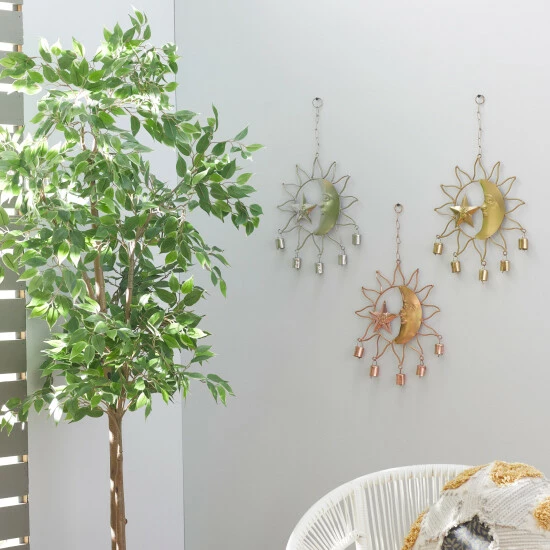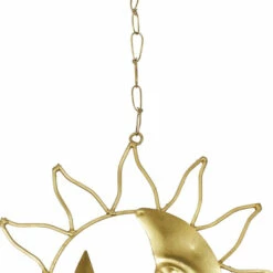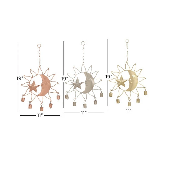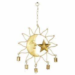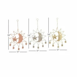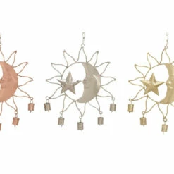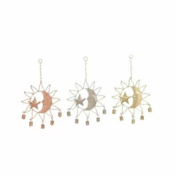 These eclectic style inspired design sun windchimes will work together as a set but can be used separately on different windows, porches or any living space for a light soothing sound. Nature’s own music sounds best when accompanied by the gentle tones of these indoor and outdoor accent pieces that feature chimes with a half moon and a star molded with a face, along with solar ray outline cutouts and bells attached underneath the frame. Add a twist to your eclectic-themed home by using this set of accent decors that will surely create a delightful accessory for your space. This wind chime set will extend a warm welcome to all your guests and can also make a great housewarming gift! This set of astronomical windchimes come in three interior-friendly tones that make them a flexible display for most types of interior design styles. Iron chain is attached at the top section to allow for easy hanging via nail or screw. Suitable for indoor use. Made in India These dreamy windchimes come in a set of 3. Eclectic design. This item comes shipped in one carton.. Eclectic design lets your personality shine in your home. This item is expertly crafted of a solid iron structure. This item comes in a polished copper, silver, and gold finishes. Each wind chime features a half moon and a star molded with a face, along with solar ray outline cutouts and bells attached underneath the frame. Each item in this set measures 11″L x 1″W x 19″H and weighs 0.43 lbs