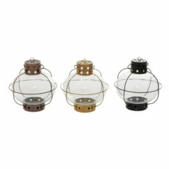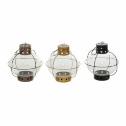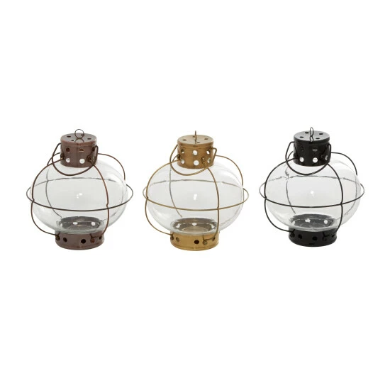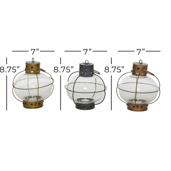 Experience the night from the olden days with this vintage style votive lantern set. The pieces are meant to hold one votive candle each, but they can also function as juxta positioned furniture accent pieces and hanging lamp fixtures in a traditional-themed house. Lanterns are constructed from iron, feature two ring handles, comes in grey, brown, and gold colors, and have platforms at the center for the candles. Lantern candle holder which can hold 1 candle each. This item ships in 1 carton. Suitable for indoor use only. Made in India. This set includes 3 lantern. Rustic Design.