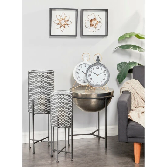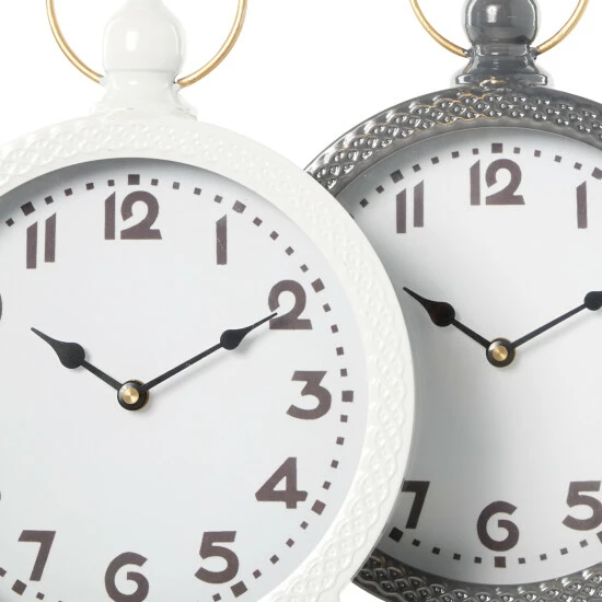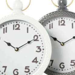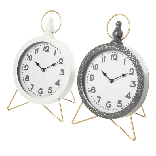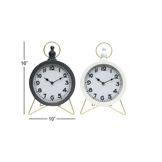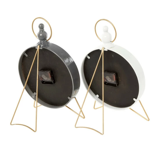 These traditional style clocks are sleek and design with a neutral finish so you can easily pair them with different décor in different parts of your home on tables, shelves, or counters. Bring cool modern style to your tabletops with this set of 2 large, round gray and white metal table clocks, each with a decorative finial, gold top loop and triangular gold feet. A decorative, textural relief border wraps around each face for an extra subtle, stylish touch. These decorative clocks have large, easy to read numbers with black arms and black dots to indicate seconds. Requires 1 AA batteries. Not Included. This item comes shipped in 1 carton. Features Arabic numerals for the hour markers. The clock mechanism runs silent. Suitable for indoor use only. This set includes 2 clock. Traditional theme.