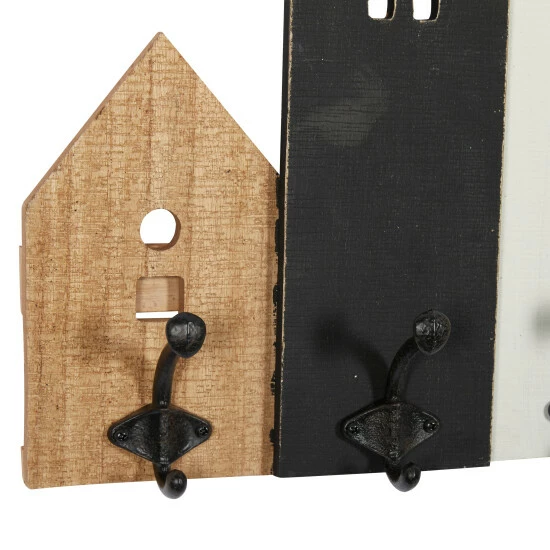 Add style to home organization with this metal and wood wall hook. This multi-purpose wall hook has five iron hooks attached to a wooden city silhouette. The wall hook features natural brown, gray, and distressed black finish, serving both style and function to home organization. Hang coats, bags, or towels in bedrooms, bathrooms, and other living spaces. This decorative wood and metal hook measures 22″ in width and 2″ in height. This item comes shipped in one carton. Easy to hang with 2 back keyhole hooks. Suitable for indoor use only. Each hook holds 5 to 8 lbs. Farmhouse-themed style.