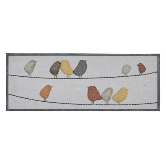 Simplistic, bright, and playful, this wall dรฉcor is the perfect addition to any room of your home. The textured wall art depicts a group of birds lounging on two wires. The birds, which pop off the canvas, are in a variety of sizes and colors, including yellow, red, and blue. The artwork brings together iron and MDF, and keyhole hangers appear on the back of the frame for convenient mounting.