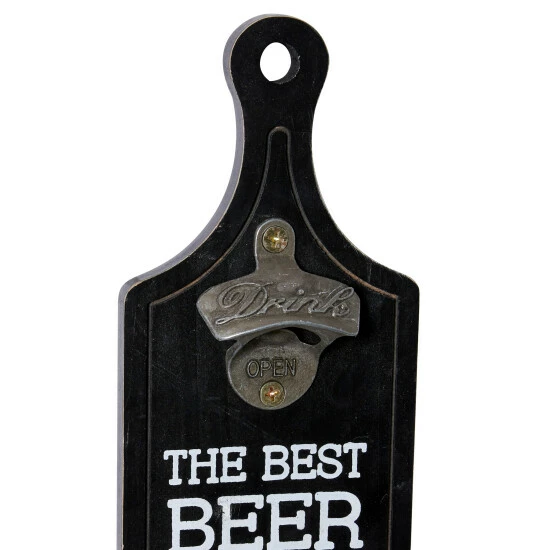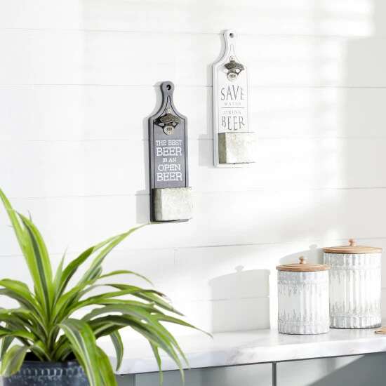 - This wall-mounted bottle opener decor is a 2-piece set of accent pieces with decorative catchers and typography