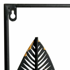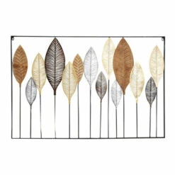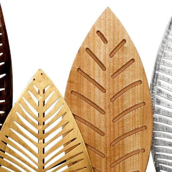 This modern wall decor features fourteen pierced gold, silver, and gray metal and natural wood leaves adhered to a metal frame. The rich texture from the leaf sculptures’ wood and metal cut-outs and staggered placement of each upright metal leaf brings your blank walls to life. The neutral metallic gold, dark gray, and silver tones, as well as warm brown wood tones, will work with almost any color palette while adding some metallic sheen when the light hits. This leaf art wall decor complements modern and natural style spaces with neutral metallic tones and botanical sculptures.
